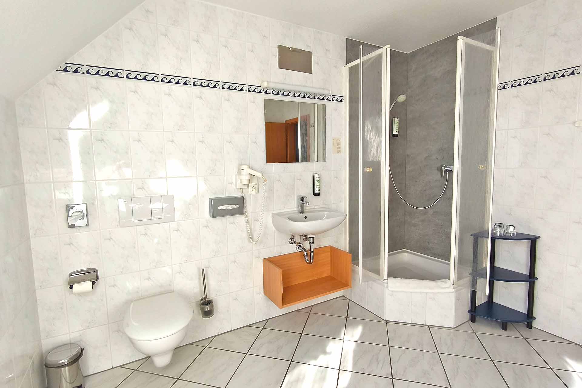 Dusche/teilweise Badewanne und Haartrockner. In den Suiten befinden sich ein Schreibtisch,